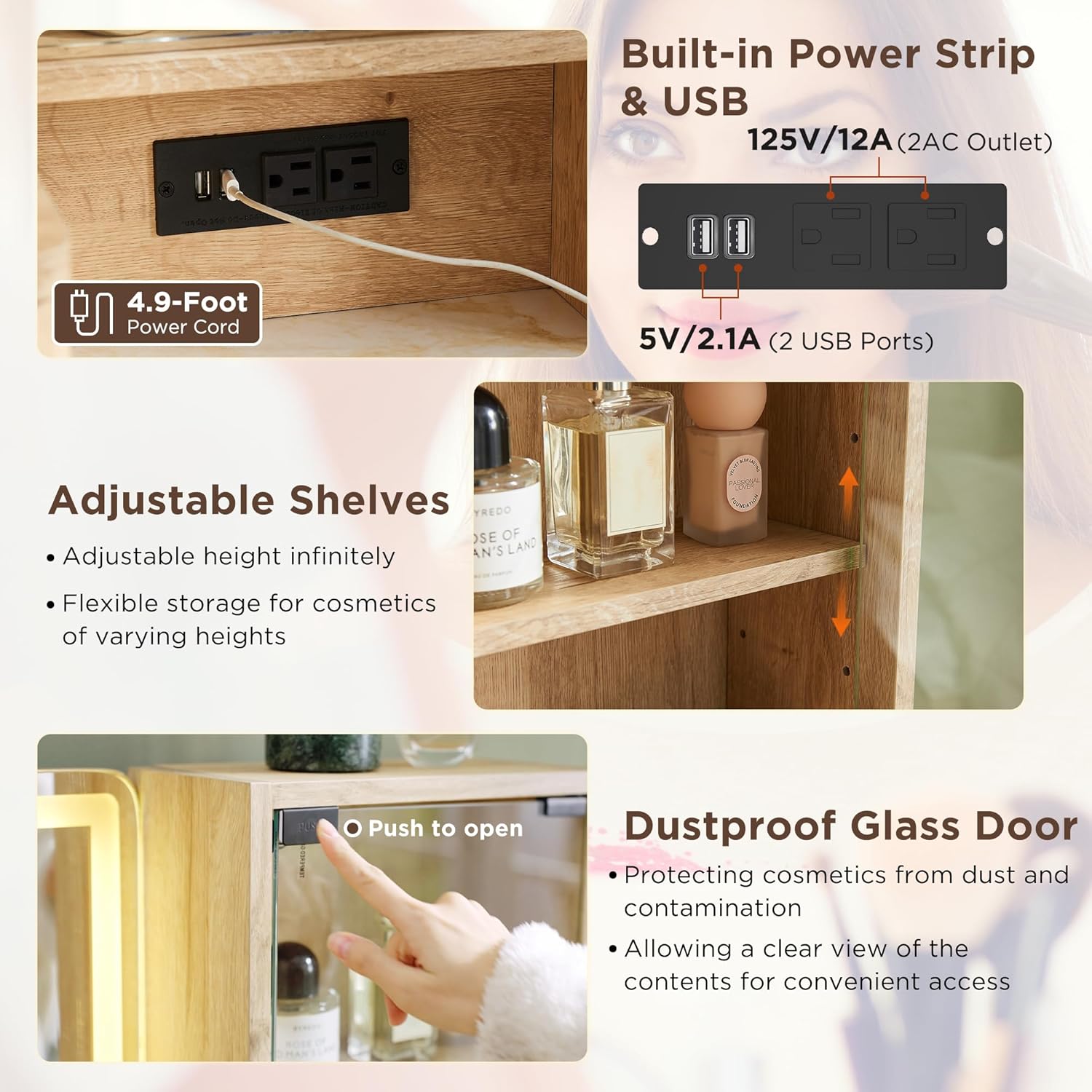 Modern Lighted Makeup Vanity Desk with Side Cabinet Adjustable Shelves Glass Top and Charging Station